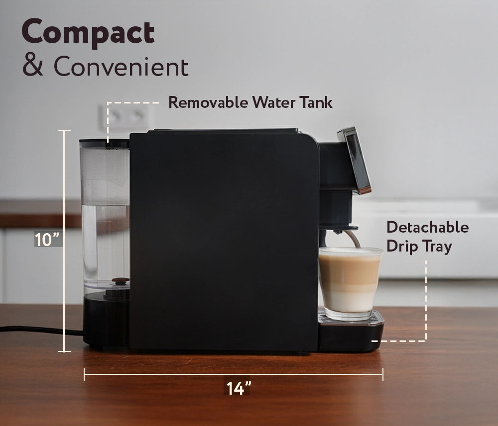 The Lattisso Pro is compatible only with Coffeeza and Nespresso® Original Line capsules. It does not support Vertuo, Dolce Gusto or CCD capsules, which use a different size and brewing system.