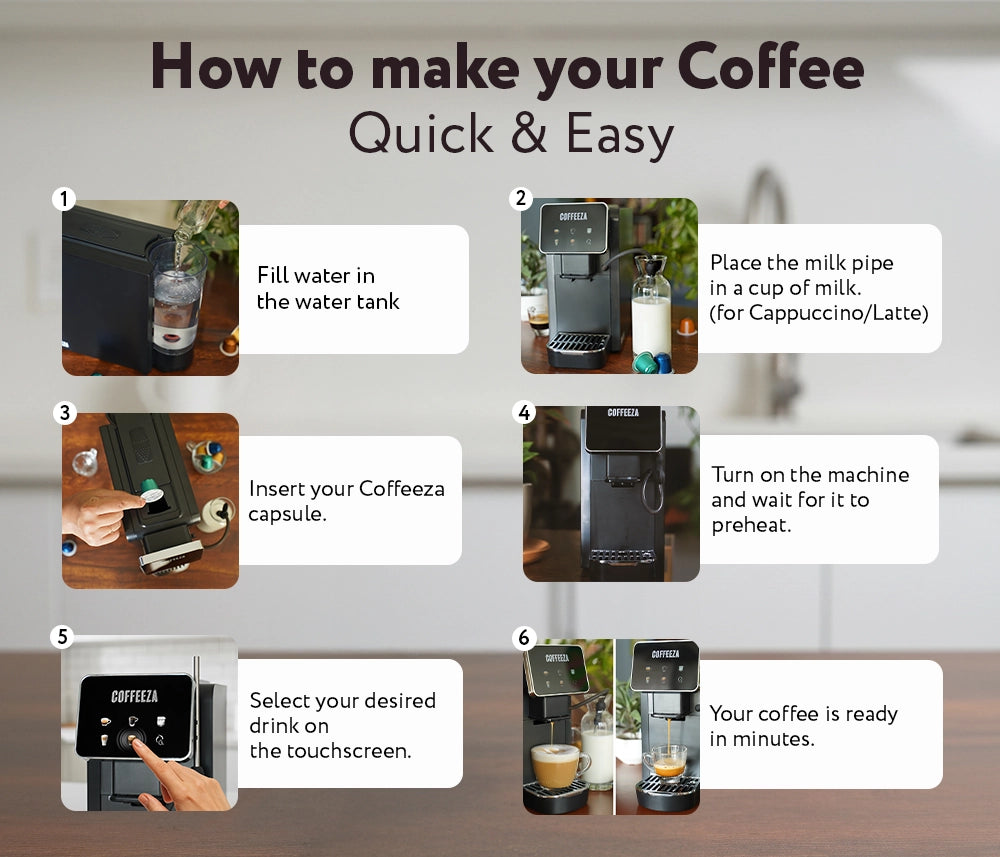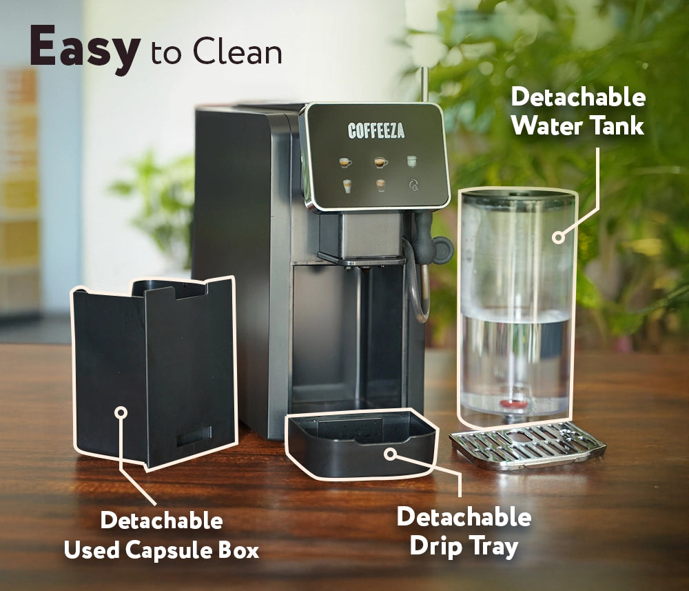 Cleaning is effortless with the one-touch auto-cleaning function that flushes both the internal coffee lines and milk pipe. Simply fill the water tank, place the milk pipe in a cup of water, position an empty cup on the drip tray, and activate the auto-clean function on the machine. The removable water tank, drip tray, and used capsule box make regular upkeep easy.