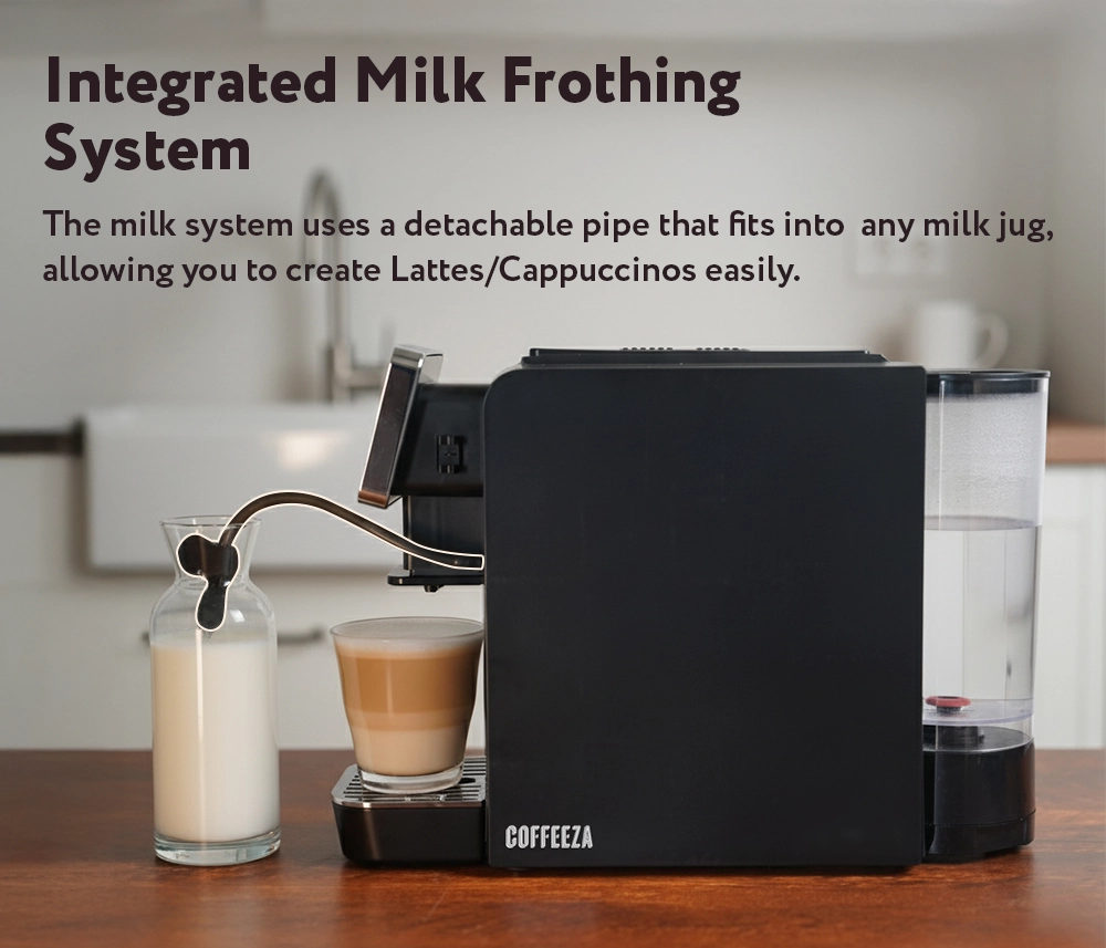 Yes, it comes with an integrated milk frothing system that uses a detachable milk pipe. Simply place the pipe into any milk jug to create creamy lattes or frothy cappuccinos with ease.
